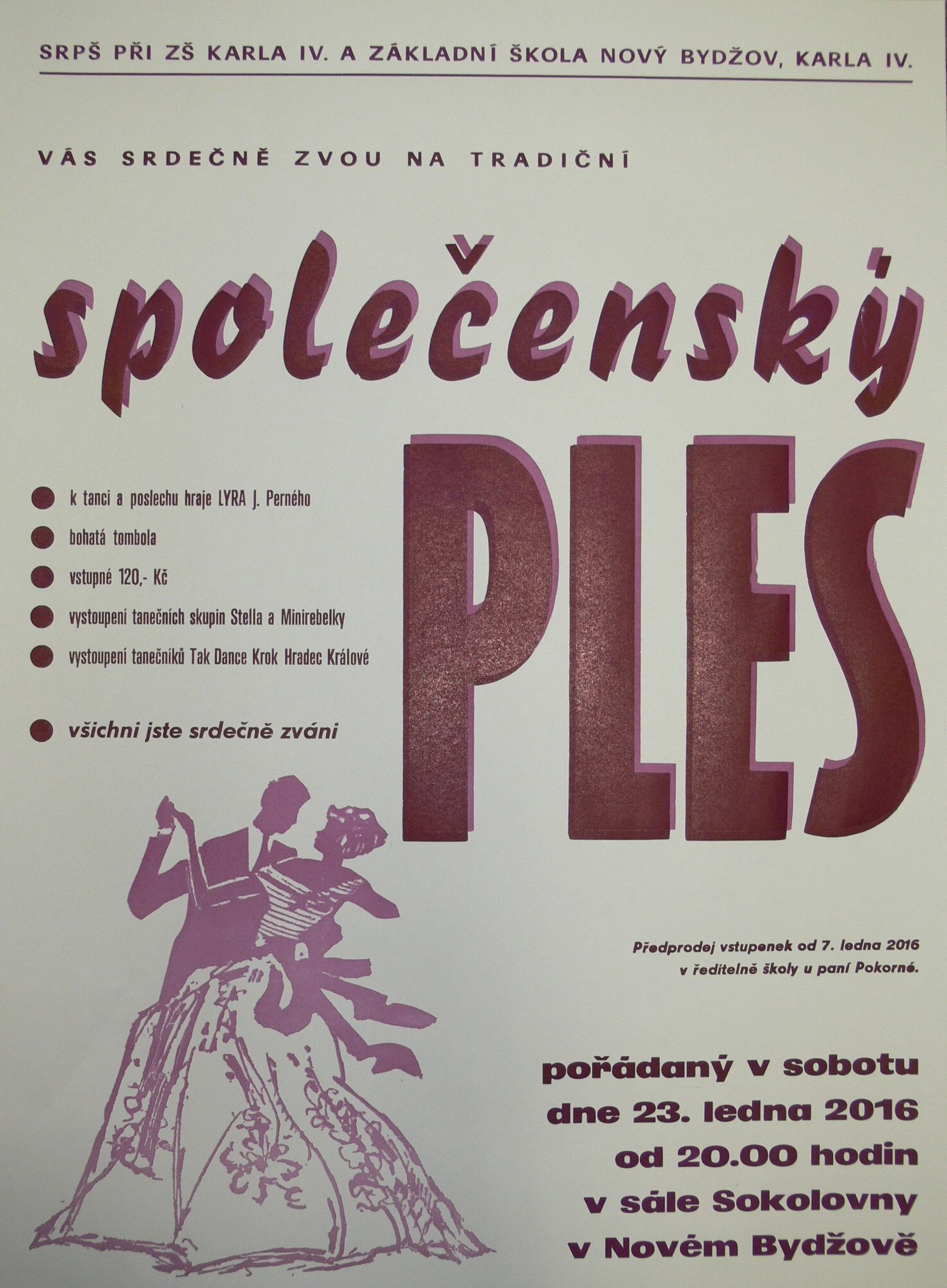 SRPŠ při ZŠ Karla IV. a ZŠ Karla IV. Vás srděčně zvou na tradiční Společenský ples, který se uskuteční v sobotu 23. ledna 2016 od 20:00 v sále Sokolovny v Novém Bydžově. Vstupenky v ceně 120,- Kč je možné zakoupit od 7. ledna v kanceláři školy u paní Pokorné.